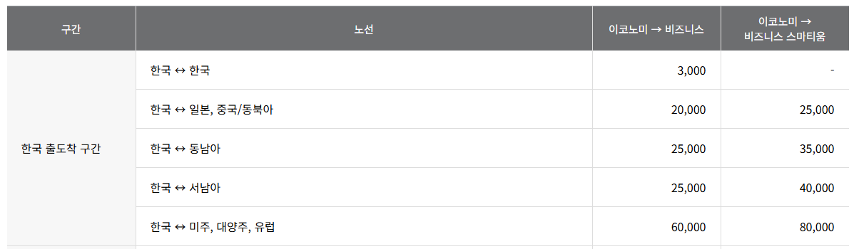 또한, 마일리지로 좌석을 승급하실 경우 해당 마일리지 사용 금액도 함께 첨부하였습니다.