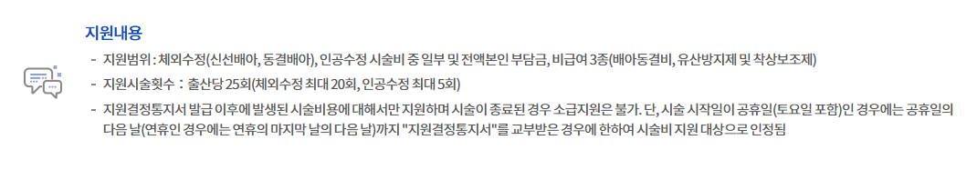- 지원 내용: 체외·인공수정 시술비 지원 (횟수 한도 내)